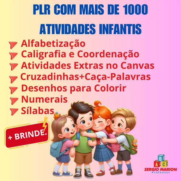 PLR com mais de 1000 Atividades Infantis, você estará investindo na educação dos seus filhos e garantindo que eles tenham acesso a recursos educativos de alta qualidade. Proporcione um ambiente de aprendizado rico e estimulante, onde as crianças podem explorar, descobrir e crescer com confiança. Transforme a alfabetização dos seus filhos e proporcione a eles um futuro brilhante. Adquira agora nosso info produto e veja a diferença que um bom material educativo pode fazer!